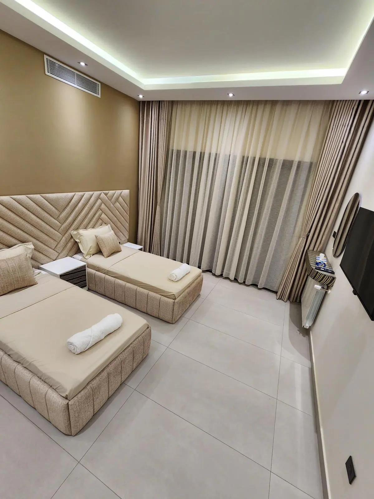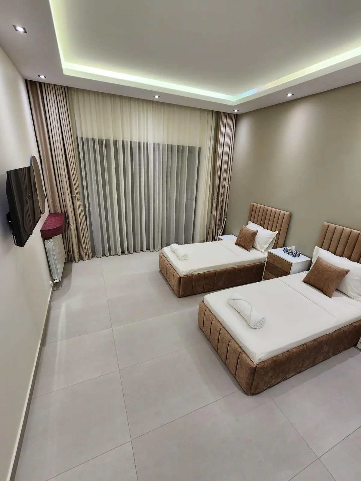 Chambres Twin (3 chambres):Trois chambres avec deux lits simples, idéales pour enfants, amis ou couples d’invités. Climatisation, TV et rangements inclus.